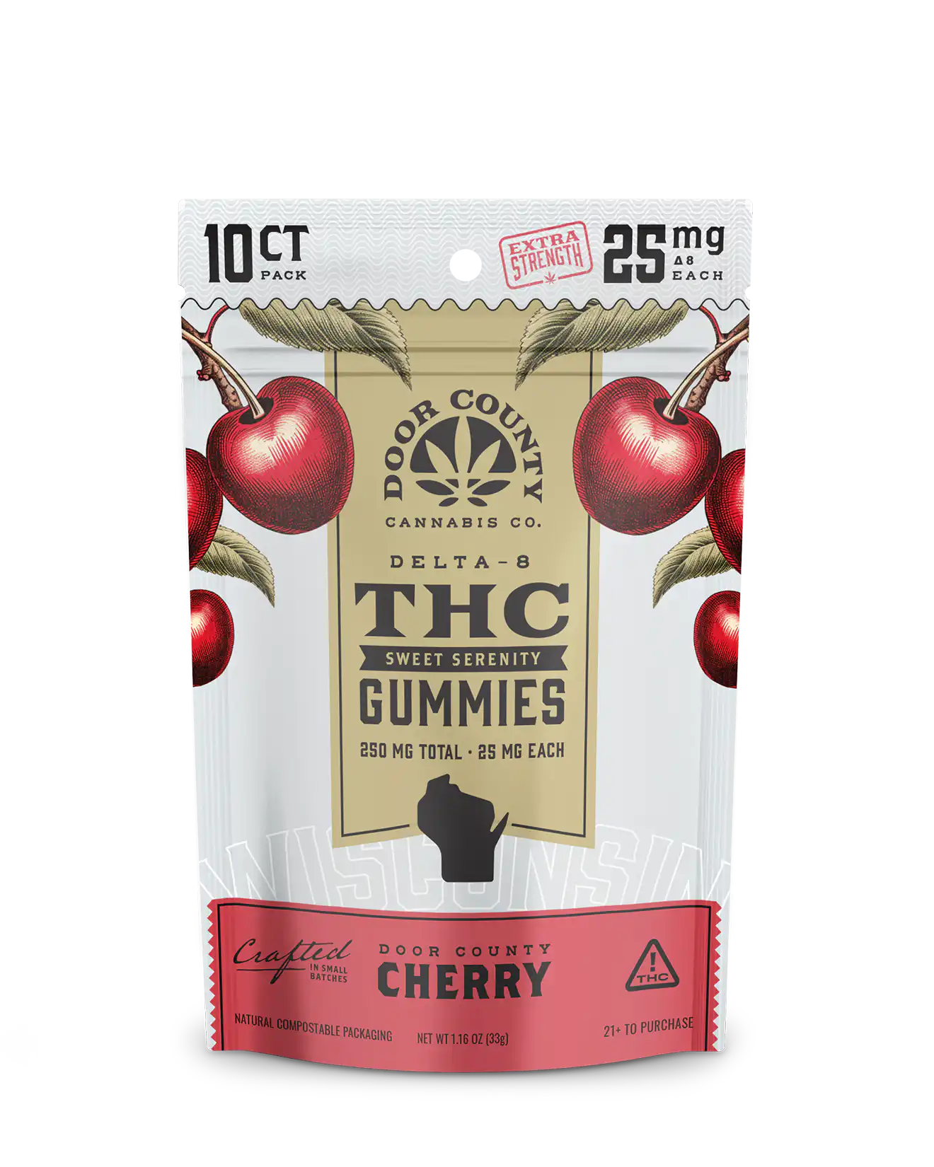 Sweet Serenity Gummies are vegan, gluten-free treats infused with 25mg of Delta-8 THC per gummy. Perfectly crafted with natural Door County Cherry flavor, they are an ideal addition to your routine.