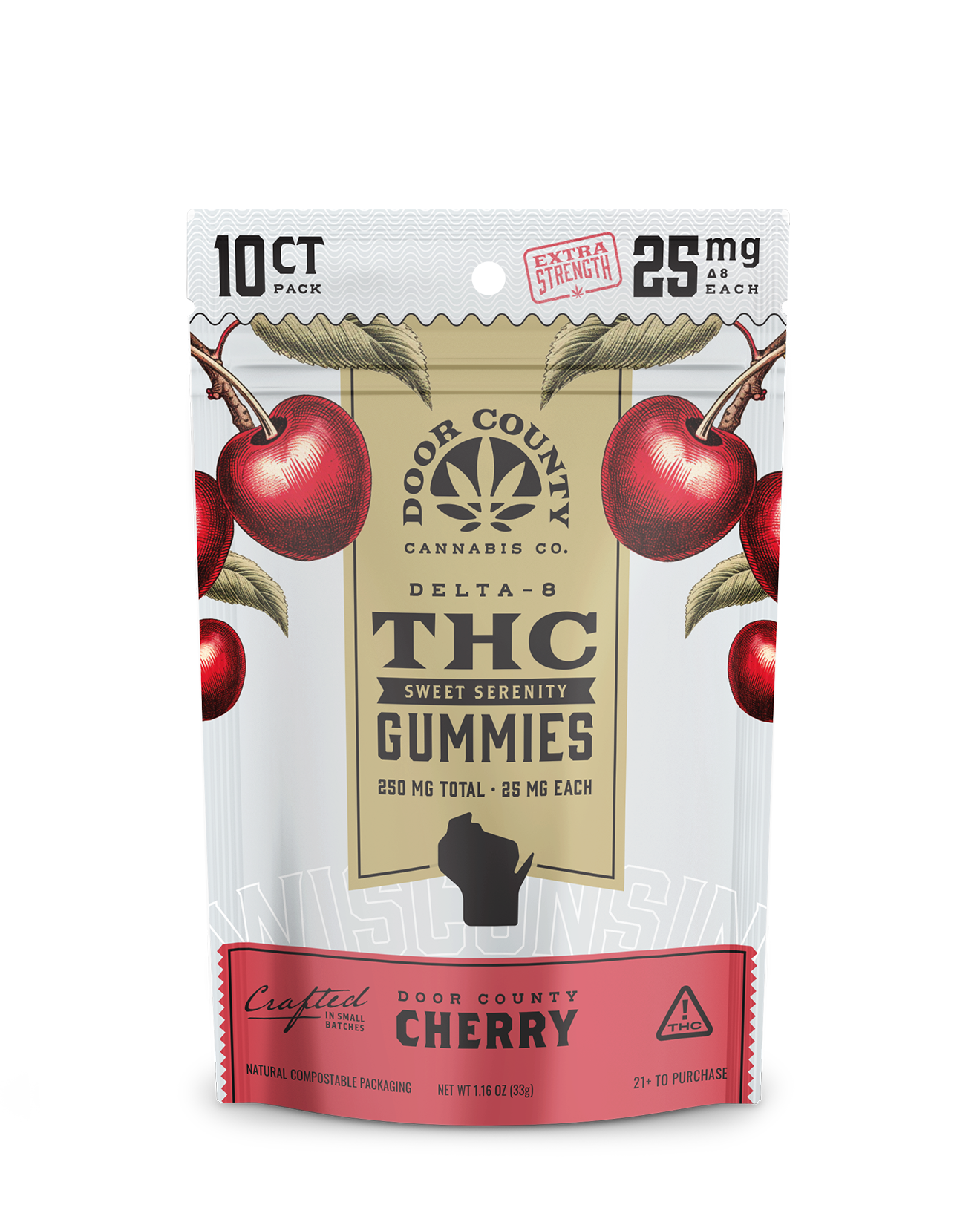 Sweet Serenity Gummies are vegan, gluten-free treats infused with 25mg of Delta-8 THC per gummy. Perfectly crafted with natural Door County Cherry flavor, they are an ideal addition to your routine.